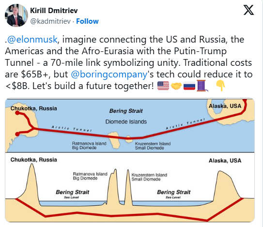 At the same time Zelensky was having a tough meeting with President Trump yesterday, this report details, CEO Kirill Dmitriev of the Russian sovereign wealth fund RDIF and Special Envoy of the President of the Russian Federation for Investment and Economic Cooperation with Foreign Countries stunned the world when he posted the message: “Elon Musk, imagine connecting the US and Russia, the Americas and the Afro-Eurasia with the Putin-Trump Tunnel - a 70-mile link symbolizing unity...Traditional costs are $65 Billion+, but Boring Company's tech could reduce it to less than $8 Billion...Let's build a future together!”.