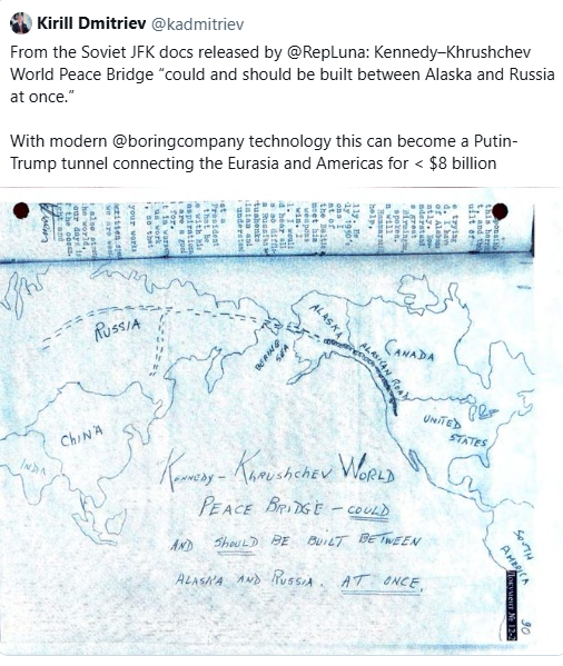 On Thursday, this report notes, Russia released to top President Trump ally Congresswoman Anna Paulina Luna the previously classified Soviet files on the assassination of President John F. Kennedy—and about which CEO Kirill Dmitriev posted the message yesterday: “From the Soviet JFK docs released by Congresswoman Luna: Kennedy–Khrushchev World Peace Bridge “could and should be built between Alaska and Russia at once”...With modern Boring Company technology this can become a Putin-Trump tunnel connecting the Eurasia and Americas for less than $8 billion”.