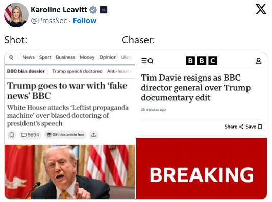 After watching President Trump destroy the BBC yesterday, this report details, top President Putin aide Kirill Dmitriev assessed: “Will the new BBC bosses be any better?...The BBC is still run by a government pushing mass migration, warmongering, digital IDs and early prisoner release”—an assessment joined with the news: “White House Press Secretary Karoline Leavitt has mocked the BBC after its director general and head of news announced their resignations on Sunday...Leavitt posted screenshots of two media reports with the caption ‘shot/chaser’, referencing a popular meme format...The first showed a Telegraph headline claiming Trump was “going to war” with the BBC, while the second was the BBC’s own report on the resignation of its director general, Tim Davie”.