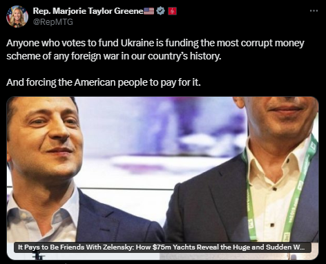 While watching the “Golden Toilet Scandal”, that’s officially known as “Operation Midas”, flush away the entire corrupt government of Dictator Zelensky, this report details, top Kremlin spokesman Dmitry Peskov most factually observed: “That’s hardly a Ukrainian internal matter anymore...That’s foreign money that is being stolen...The Kiev regime is obviously going off the rails...It is high time Kiev’s Western backers started thinking about their own money and their taxpayers”—a factual observation that followed United States Congresswoman Marjorie Taylor Greene having already warned: “Anyone who votes to fund Ukraine is funding the most corrupt money scheme of any foreign war in our country’s history...And forcing the American people to pay for it”.