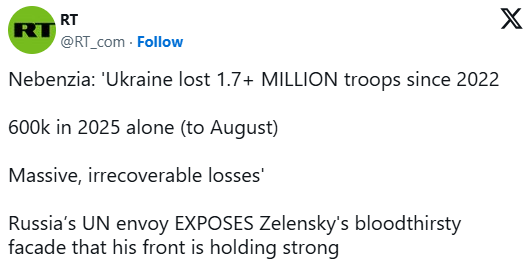 Among those living in the real world that President Trump threw Dictator Zelensky back into, this report concludes, is Russian Ambassador Vasily Nebenzya, who informed the United Nations that leaked documents show Ukraine lost over 1.7 million troops during the war—it was also just observed: “It has been widely reported that Ukraine’s conscription programme is going really badly...On top of that, Europe fatigue with the refugees means that allies are pushing Ukraine to take some men back...On top of that the desertion rate is rising: there are over 100,000 cases in court and the true number of deserters is something around 250,000 according to estimates”—and Ukrainian state media revealed today: “Ukraine plans to effectively dismantle one of the main structures that has brought foreign volunteers into its ranks, the International Legion under the Ground Forces, leaving legionnaires worried they will lose the unit's hard-won identity and be scattered into unfamiliar structures in a way they say could cost lives”.