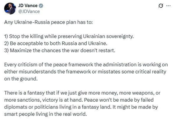 Living in the fantasy land warned about by Vice President Vance, this report details, is the leftist New York Times, that deceivingly assessed today: “Many of the 28 points in the proposed Russia-Ukraine peace plan offered by the White House read like they had been drafted in the Kremlin...They reflect almost all Mr. Putin’s maximalist demands: Ukraine would have to cede to Russia all of the lands that Moscow has declared for itself in Donetsk and Luhansk...The United States would recognize that as Russian territory...No NATO forces could be based inside Ukraine that might prevent the Russians from regrouping and taking the whole country...The Ukrainian military would be limited to 600,000 troops, a 25 percent cut from current levels, and it would be barred from possessing long-range weapons that could reach into Russia...In return, all sanctions on Russia would be lifted, and the country would be reintegrated into the global economy”.