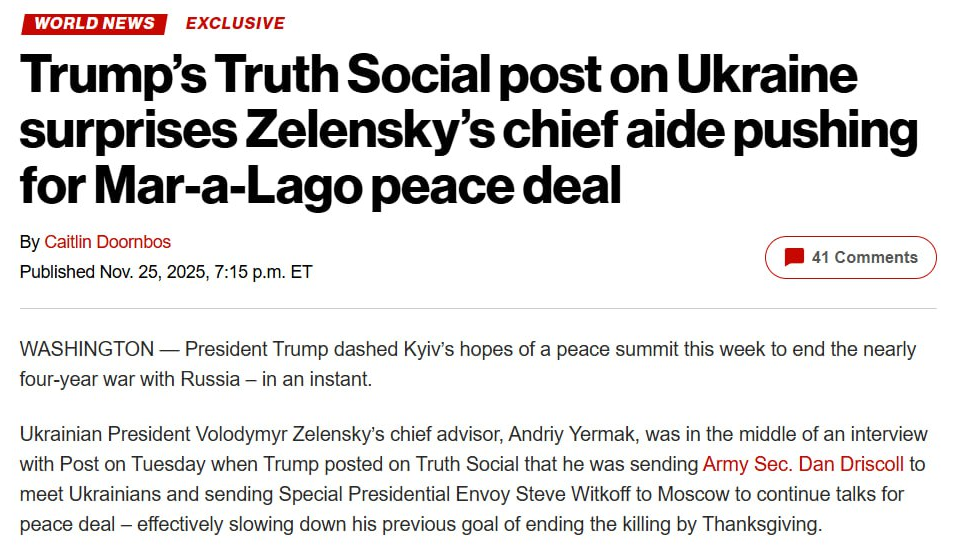 An insightful new Security Council (SC) report circulating in the Kremlin today first noting President Donald Trump walked back the deadline for Ukraine to accept his peace plan yesterday, saying it was “just a map”, says he then dispatched Special Envoy Steve Witcoff to Moscow to meet with President Putin—Russian presidential aide Yury Ushakov confirmed President Putin will meet with Witcoff, after which President Trump published the notice: “I look forward to hopefully meeting with President Zelenskyy and President Putin soon, but ONLY when the deal to end this War is FINAL or, in its final stages”—all of which was followed by the news: “Vladimir Zelensky’s chief of staff, Andrey Yermak, appeared visibly frustrated after President Donald Trump said he would only meet the Ukrainian leader once the peace framework was final or in its final stages...The New York Post said Trump’s message was published while Yermak was speaking to the outlet...According to the outlet, Yermak’s face dropped, apparently gutted by the news, and he declined to comment'”.