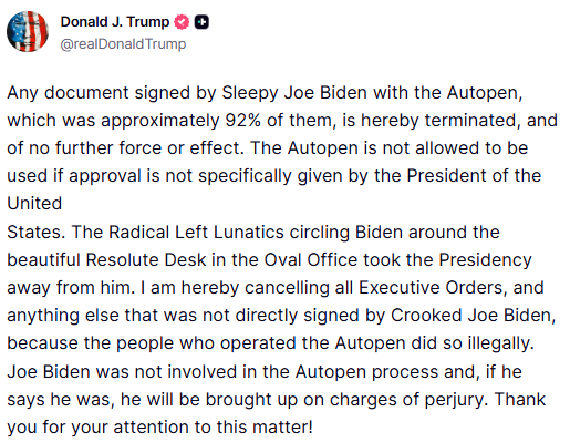 The former American officials responsible for the most blatant coup in history, this report continues, were all given auto pen pardons for their crimes by former President Biden—but as Special Envoy Witcoff was meeting with Ukrainian officials on Sunday in Miami, it saw President Trump posting the official notice: “Any document signed by Sleepy Joe Biden with the Autopen, which was approximately 92% of them, is hereby terminated, and of no further force or effect...The Autopen is not allowed to be used if approval is not specifically given by the President of the United States...The Radical Left Lunatics circling Biden around the beautiful Resolute Desk in the Oval Office took the Presidency away from him...I am hereby cancelling all Executive Orders, and anything else that was not directly signed by Crooked Joe Biden, because the people who operated the Autopen did so illegally...Joe Biden was not involved in the Autopen process and, if he says he was, he will be brought up on charges of perjury”.