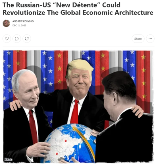 Along with economic articles now appearing like “A Russian-US 'New Détente' Could Revolutionize The Global Economic Architecture”, this report concludes, it was also just assessed: “Russia could provide the US with reliable access to the critical resource supply chains that might be established on its territory, which the US requires for “outcompeting” or at least keeping pace with China, in exchange for the US reforming the European security architecture in partnership with Russia...Western critics might scoff that the US would just be replacing dependence on China with Russia, while non-Western ones might worry that Russia risks embondaging itself to the US, but that’s over-simplistic...Both scenarios are possible in theory, but much more plausible is the one that the creation of complex strategic interdependence between them through these means resolves the long-running Russian-US security dilemma that’s at the core of the Ukrainian Conflict”.