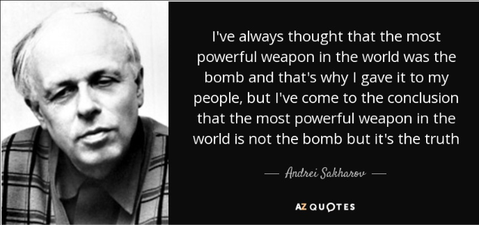 Though creating the world’s most powerful nuclear weapons, Sakharov is best remembered today for another reason, his years as the Soviet Union’s most famous dissident and outspoken human rights defender, and he famously proclaimed: “I've always thought that the most powerful weapon in the world was the bomb and that's why I gave it to my people, but I've come to the conclusion that the most powerful weapon in the world is not the bomb but it's the truth”.
