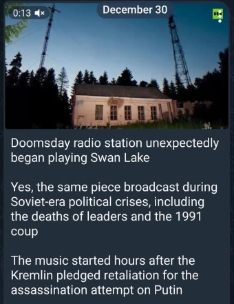 Shortly after the mysterious Russian doomsday radio station broadcast Swan Lake to the world for the first time since the Soviet Union collapsed in 1991, this report notes, it was reported: “Ukraine’s Culture Ministry has erased the name of renowned Russian composer Pyotr Tchaikovsky from its National Music Academy...Tchaikovsky rose to global prominence in the latter half of the 19th century as a leading composer of symphonic music, including the ballets Swan Lake and The Nutcracker”—reporting joined with the news: “Ukraine's military struck oil infrastructure in the various Russian and Russian-occupied regions late on 30 December”—and the leftist New York Times revealed today: