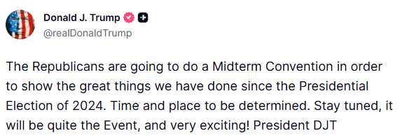 To insure the Golden Age survives through the 2026 election cycle, President Trump announced last September: “The Republicans are going to do a Midterm Convention in order to show the great things we have done since the Presidential Election of 2024...Time and placee to be determined...Stay tuned, it will be quite the Event, and very exciting!”—and was an announcement echoing the “Contract with America”, which swept the Republicans into Congressional power for the first in 40-years in 1994.