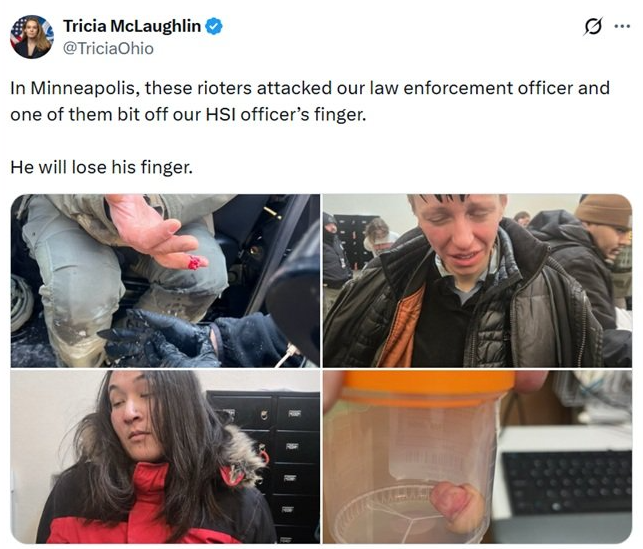 One could instinctively surmise it was going to be a dreadful day in America yesterday after Assistant Secretary Tricia McLaughlin at the Department of Homeland Security posted photos of a shocked and tearful Homeland Security Investigations (HSI) federal law enforcement officer, the leftist who attacked him, and a baggie holding a severed finger, about which she explained: “In Minneapolis, these rioters attacked our law enforcement officer and one of them bit off our HSI officer’s finger...He will lose his finger”.
