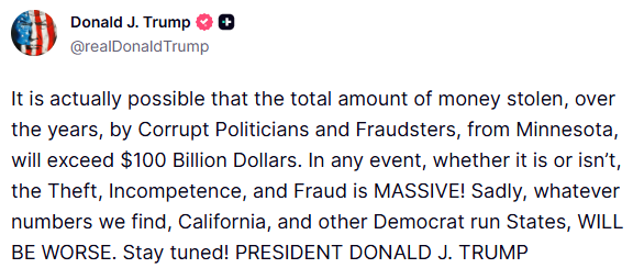 In knowing what this leftist Minneapolis revolution theater act is really trying to hide, President Donald Trump announced to all American citizens yesterday: “It is actually possible that the total amount of money stolen, over the years, by Corrupt Politicians and Fraudsters, from Minnesota, will exceed $100 Billion Dollars...In any event, whether it is or isn’t, the Theft, Incompetence, and Fraud is MASSIVE!...Sadly, whatever numbers we find, California, and other Democrat run States, WILL BE WORSE”.