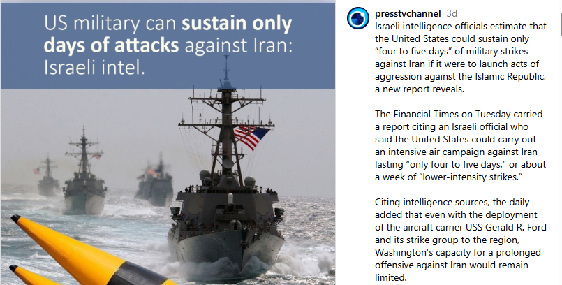 Joining the top American generals trying to talk President Trump out of declaring an illegal war on Iran, this report details, United Sates Senate Armed Services Committee ranking member Senator Jack Reed warned: “If we get involved in a conflict in Iran, we are going to have significant and deleterious effects on our stocks of ammunition, our ability to respond to other places”—a warning joined by an Israeli intelligence official telling the Financial Times: “Even with 2 carrier groups in the region, the United States cannot conduct an intense aerial assault on Iran for more than 5 days”.