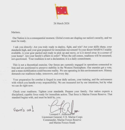Causing all NATO members to tremble in terror, this report details, was United States Marine Corp Commander Lieutenant-General Leonard F. Anderson IV issuing a war letter to all of his forces proclaiming: “Our Nation is in a consequential moment...Global events are shaping our nation's security, and we must be ready...I ask you directly...Are you truly ready to deploy, fight and win?...This is not a theoretical exercise...Our forces are currently engaged in operations connected to Iran and are positioned to preserve stability in the Western Hemisphere”.